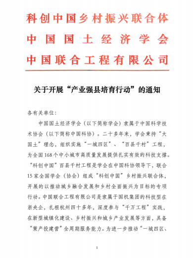 近日,“科创中国”乡村振兴联合体、中国国土经济学会、中国联合工程有限公司联合印发《关于开展“产业强县培育行动”的通知》(以下简称《通知》),拟携手相关单位共同推动“产业强县培育行动”相关工作。