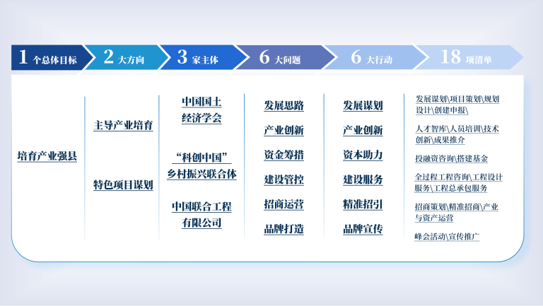《通知》提出,将联手多家全国学(协)会、国有企业,协同高校、科研院所与特色企业,围绕主导产业培育、特色项目谋划等方向,聚焦县(市、区)域产业(或项目)发展过程中急需解决的“发展思路、产业创新、资金筹措、建设管控、招商运营、品牌打造”等问题,通过发展谋划、产业创新、资本助力、建设服务、精准招引、品牌宣传“六大行动”,提供“清单式”服务,为地方城乡产业高质量发展和乡村全面振兴,研究新路径,探索新模式,树立新标杆。